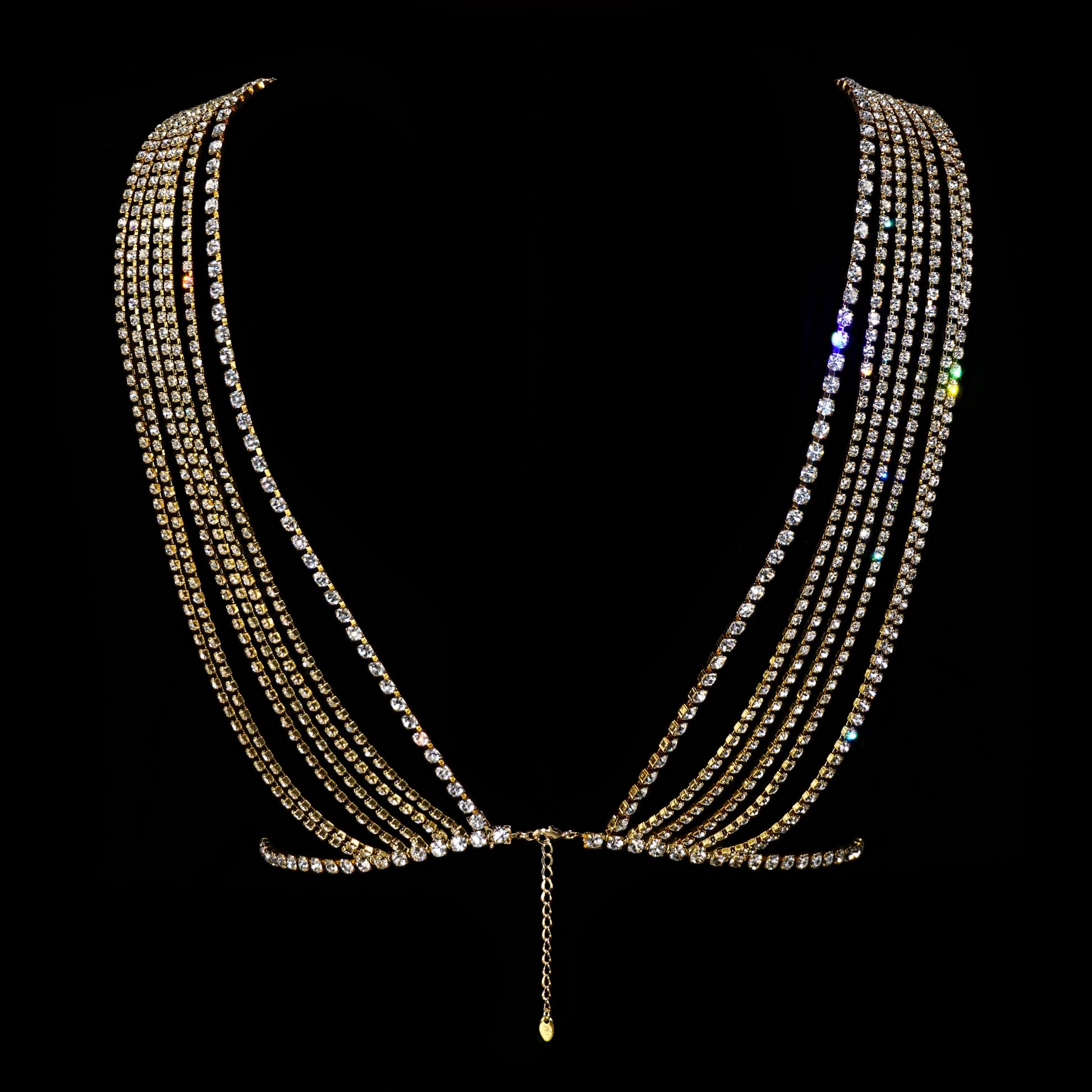 Crystal "Tanaya" Tank with open sides & v-shaped back made to your measurements. Plated in 18k gold, silver or gunmetal. Glass crystal imported from Czech Republic & handmade in Los Angeles. Production time 10 days + shipping.