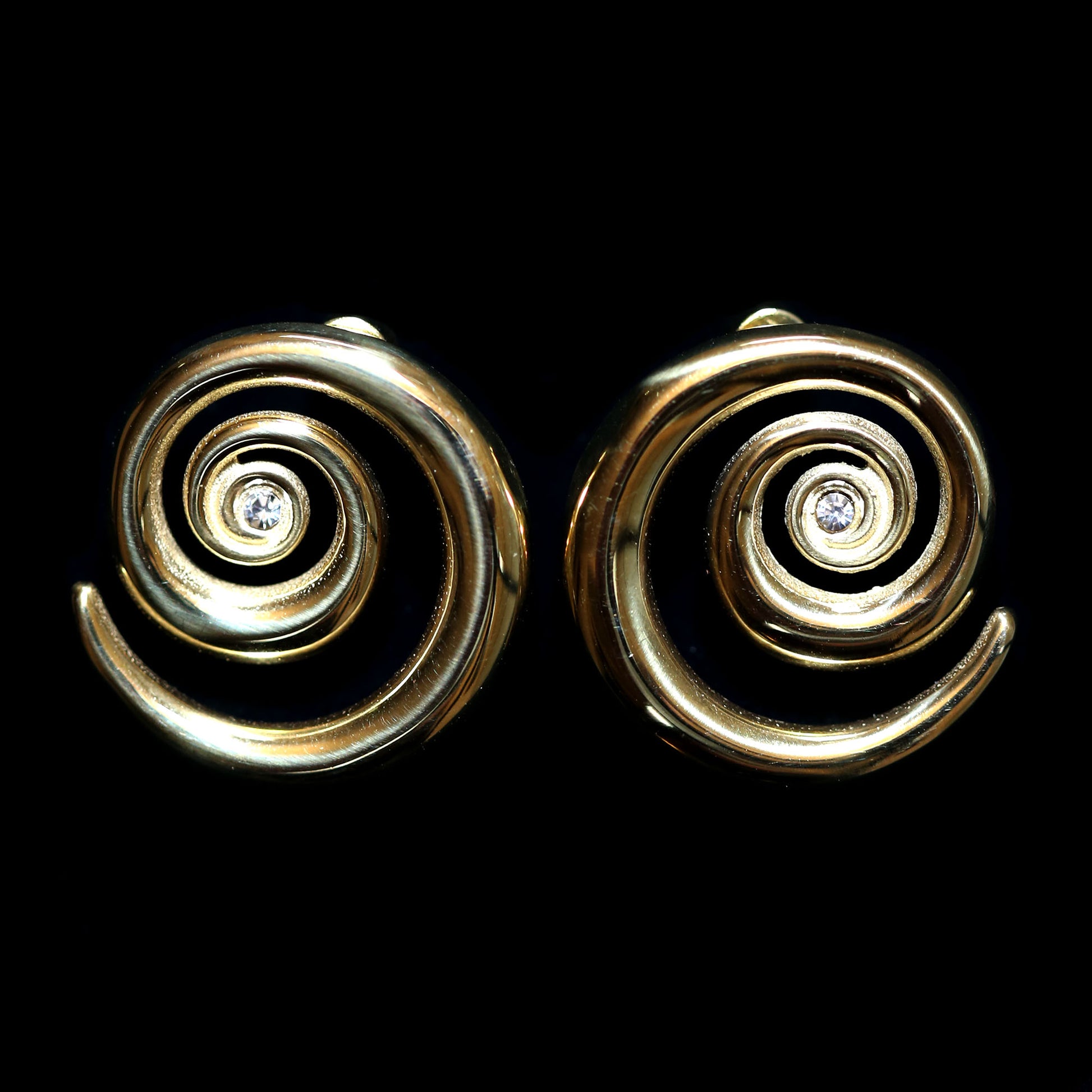 Sculptural spiral earrings designed with a fluid, coiled silhouette and a subtle CZ accent at the center for a refined touch of shine. The dimensional design creates visual movement while maintaining a bold, sculptural presence on the ear.