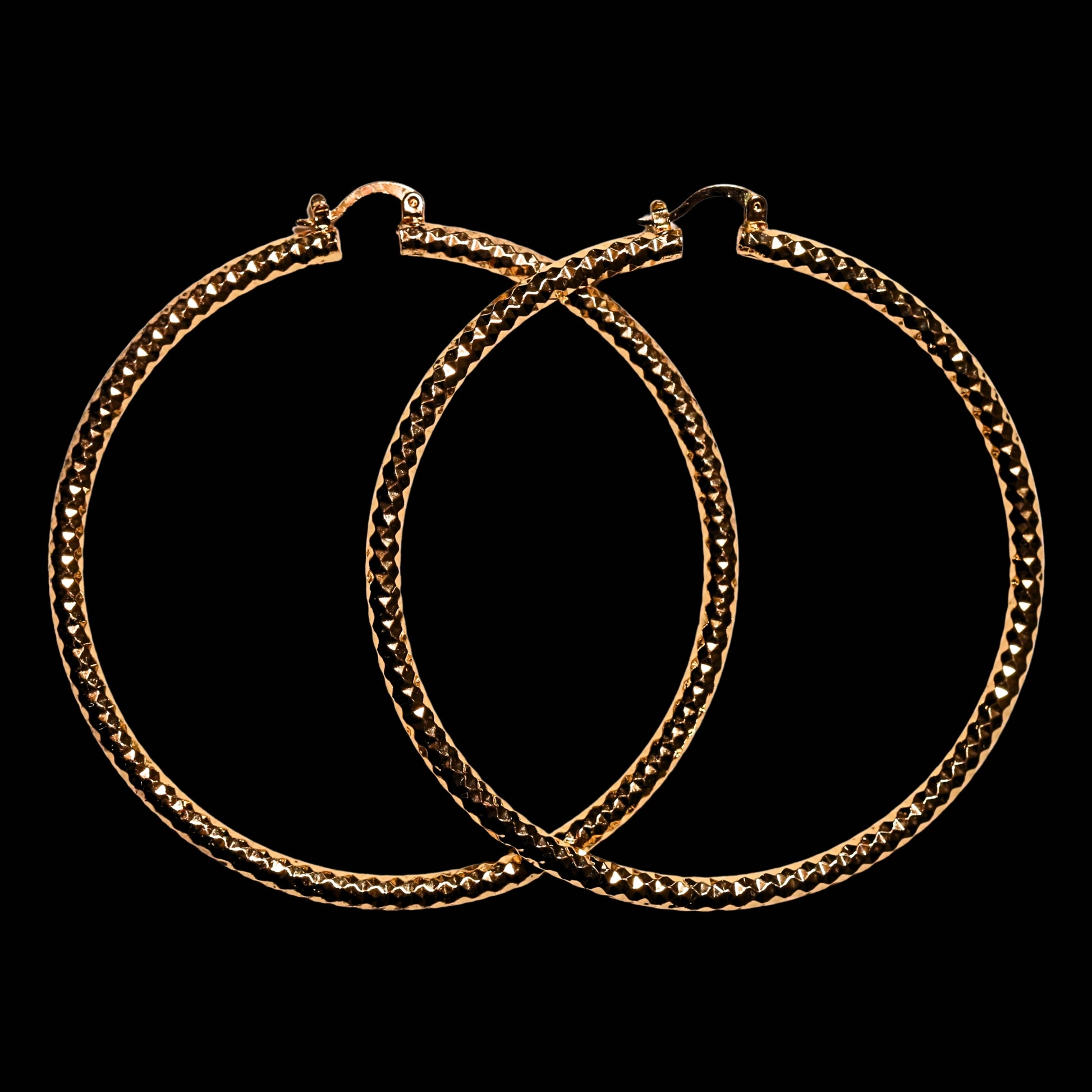 Classic gold hoop earrings designed with a textured, faceted finish that catches the light from every angle. Bold yet timeless, these hoops add subtle dimension and shine while remaining effortless enough for everyday wear.