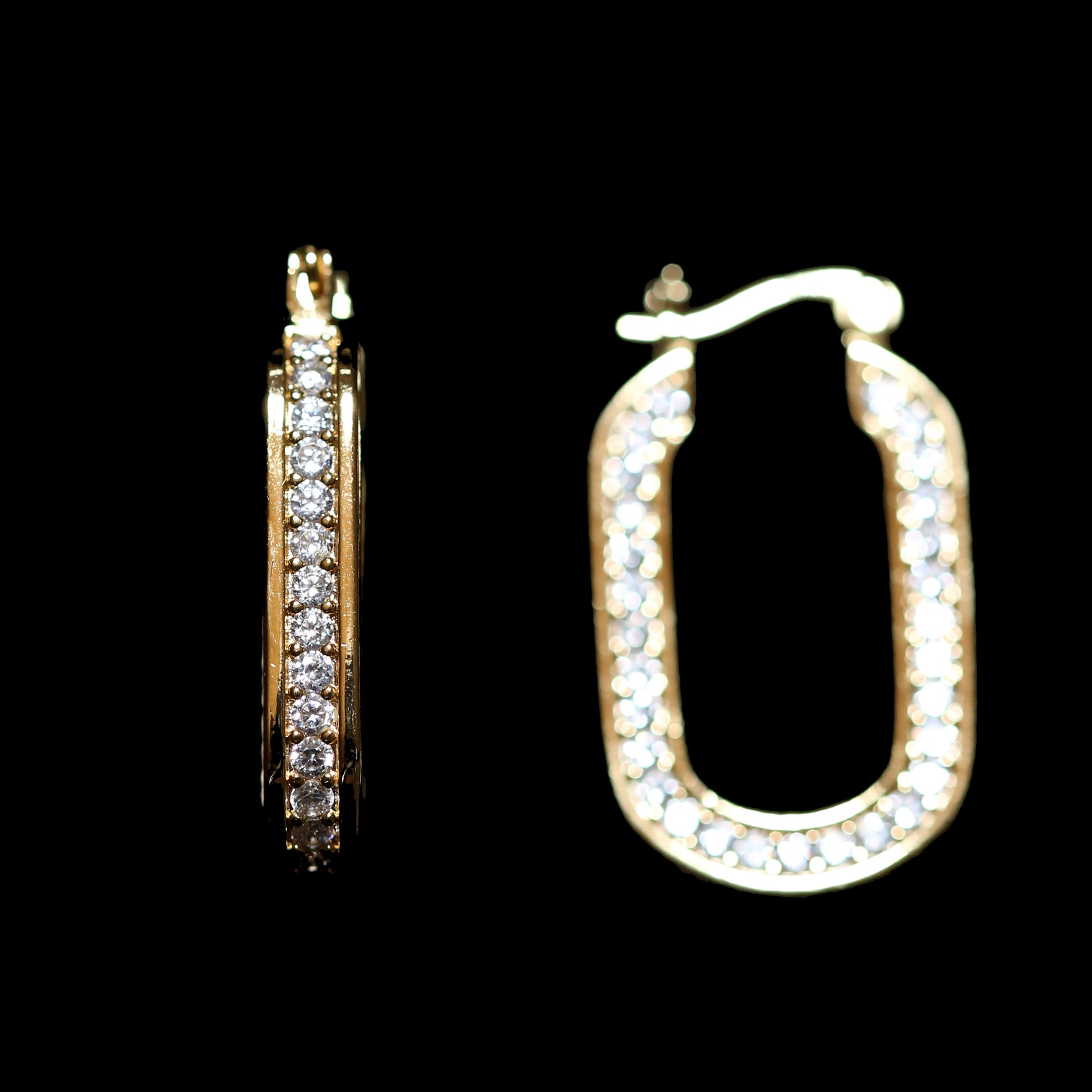 Sculptural rectangular gold hoop earrings encrusted with precision-set CZ stones for a sleek, architectural statement. Designed with clean lines and a dimensional profile, these earrings balance bold structure with refined shine.